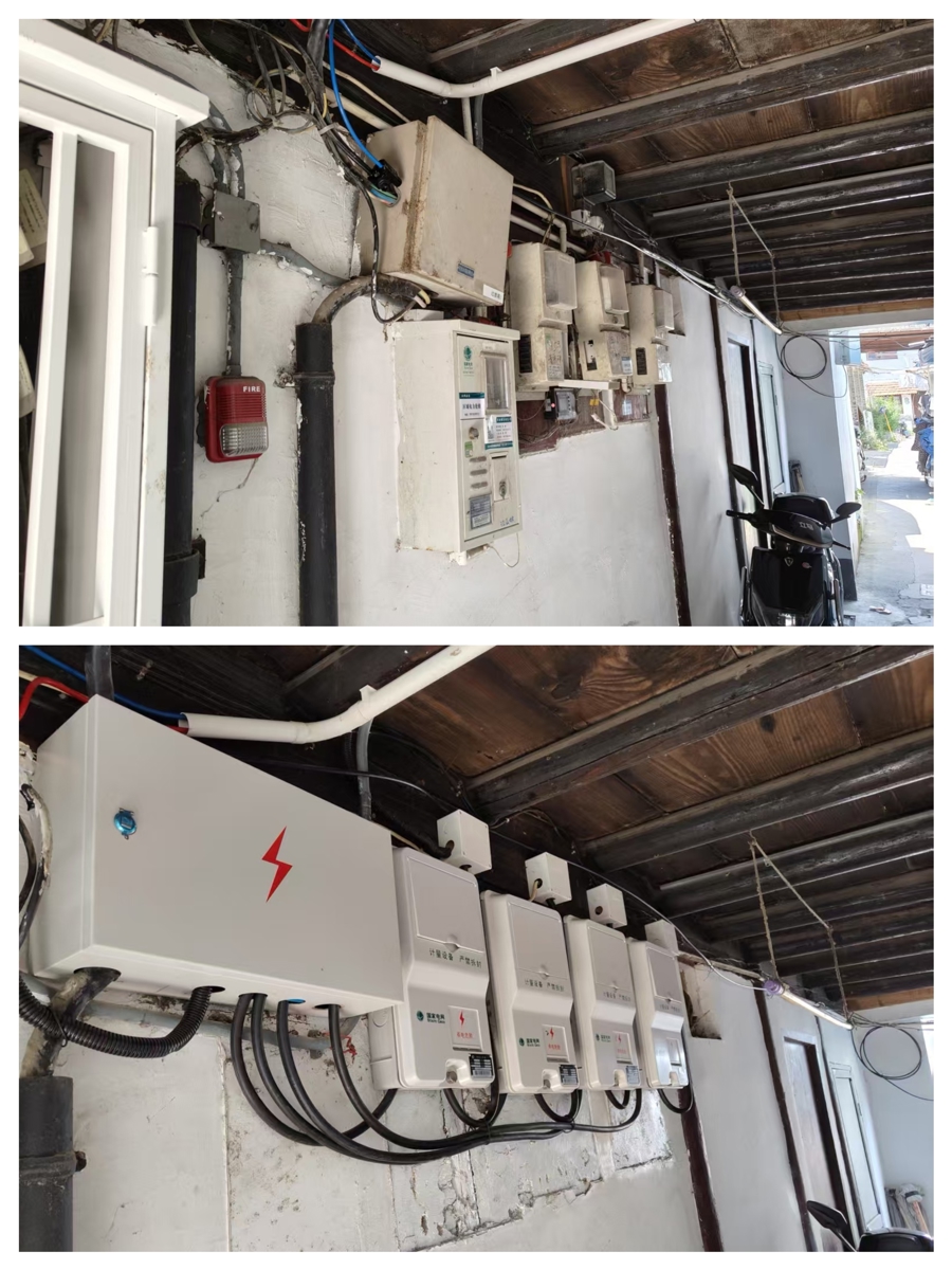 例如,在漕河街、东湖街等重点街区,电力部门累计替换640余米架空线路、拆除53处墙支架,彻底消除“蜘蛛网”现象,让沿街线路“隐身”于屋檐之下,显著改善街区视觉景观。同时,协同镇规建办对11台分支箱进行仿古美化改造,外壳采用防腐木结构,铭牌采用仿木纹工艺,顶部加装仿古歇山顶造型,与古镇建筑风格浑然一体;在40条弄堂安装仿木纹安全用电提示牌,使电力设施成为文化景观的有机组成部分。