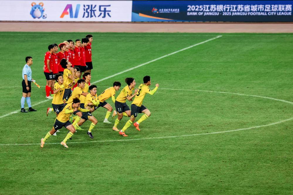 点球大战中,南通队主罚的第一球偏离球门,最后一球被泰州队门将扑出;泰州队主罚的4球均稳稳命中。