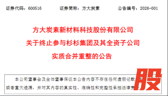1月4日晚间,方大炭素(600516)(600516)披露《关于终止参与杉杉集团及其全资子公司实质合并重整的公告》。